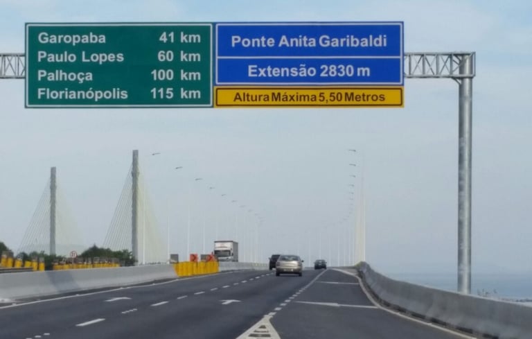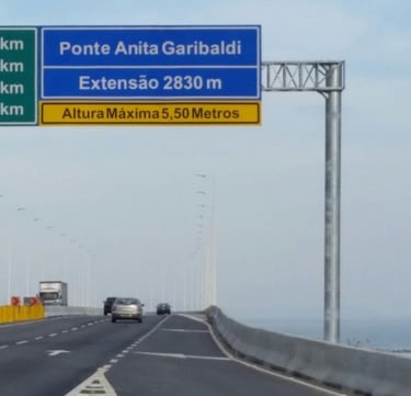 Pórtico de sinalização viária com placas indicativas, instalado conforme as normas do DNIT. Este modelo foi implantado a pedido da Construtora NEOVIA, nas rotas que dão acesso a Xanxerê, Chapecó e São Miguel do Oeste